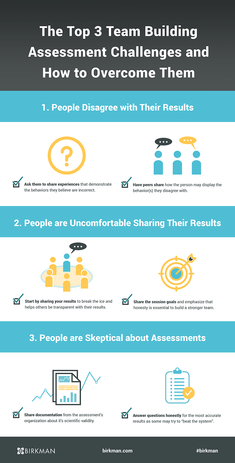 Learn about the Top 3 challenges (and solutions) to team building with assessments in this infographic: