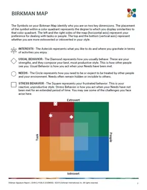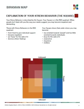 No one wants to be labeled or pigeon-holed. I try to quickly reassure that Birkman prides itself on the fact that we never assign people to a single box or pin one label on a person. The Birkman Map is multi-dimensional, plotting four different symbols for each person. The map as a convenient visual is certainly not the last word, but it offers a way to begin to see the natural complexity we humans share.Once again, it's helpful to remind your partner that the map is a high-level aerial view, much like being in a plane about to land. You recognize where you're landing but won't see the details until you're on the ground. We'll delve into these critical details in the next pages and get more precise with the language.