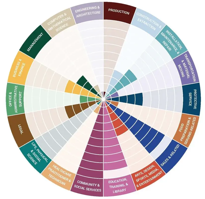 Exploring career possibilities kicks off with a brightly colored wheel that features job family titles taken directly from the United States Department of Labor's website. It's the Occupational Outlook site sponsored by the U.S. government and referred to as the O*Net. While Birkman did not create these job categories, we based our years of career research on these well-established job categories and descriptions. It is important to let your partner know that each job family contains many kinds of jobs. We derived their intensity of "fit," which can be seen on page 28, by matching their responses to each item (question) on our questionnaire to the responses of people who had tenure or job satisfaction in those areas. Our research team was able to validate 22 job families for our reporting. Four of these do not appear on the wheel because they are trade or skills-based careers that don't mandate formal or academic education. What is shown on the wheel are the 18 career categories that constitute a multitude of professional careers.