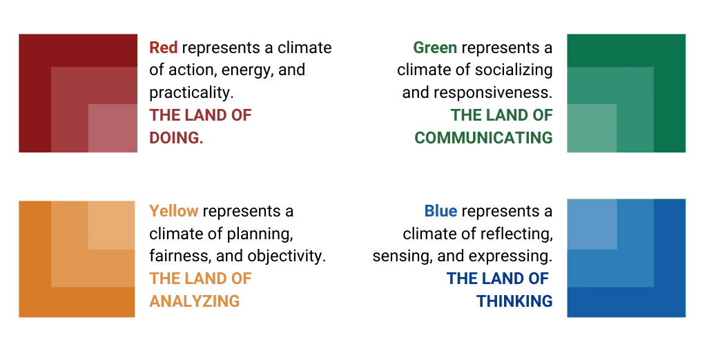 It's important to keep in mind, however, that maps are never perfect! The smaller the map's scale, the more detail it may exclude, even if there are no actual errors. Because of the scaling of maps, features are often simplified or averaged out. This same thing is true for the Birkman Map. The Birkman Map provides a lot of helpful information on understanding different types of personalities. Still, it will not provide the same level of detail into someone's personality as if you were to use a different tool. For example, if you want to see a specific geographic element's features, you likely wouldn't use a map, you'd use something more like... a magnifying glass. Likewise, if you wanted to look into the details of yours or another's behaviors, you wouldn't use the Birkman Map. You would use the Birkman Components, giving you more detailed insights into someone's behavioral style. From a simple, high-level view, the Birkman Map outlines four unique archetypes—Doer, Communicator, Analyzer, and Thinker—each representing a very different climate of personality.