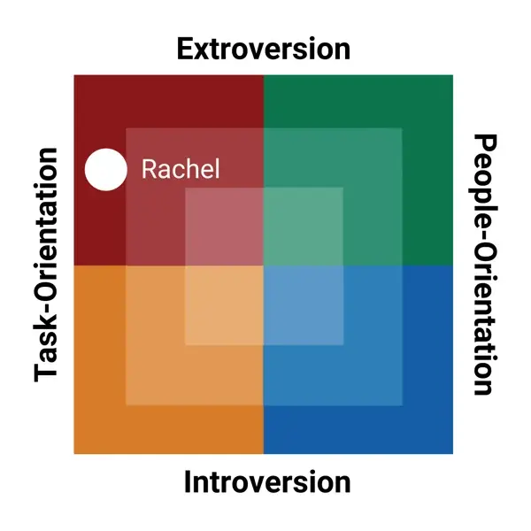 Below is a sample of the Birkman Map. You can see that two axes run across the Map; from top to bottom lies the continuum of Extroversion and Introversion, and from left to right, we see Task-Orientation to People-Orientation. These axes divide the Map into four different color quadrants, which include Red, Green, Yellow, and Blue. These are the four core archetypes representing Birkman's behavioral and personality styles.