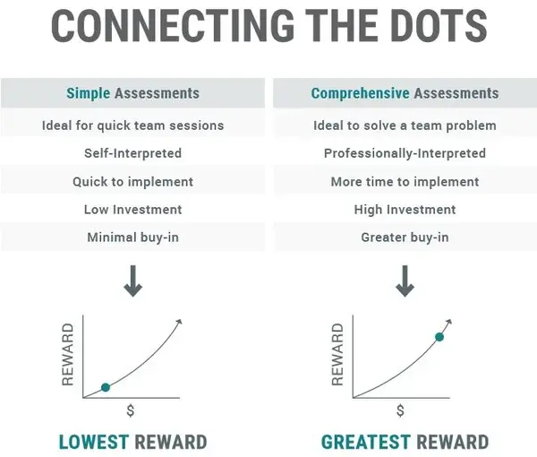 Think again about your team building goals. If you are trying to solve a significant team problem but are opting for an assessment that requires minimal investment, reconsider the resources you are willing to allocate towards your team building plan. You may have a hard time finding an option that identifies the specific roadblocks your team is facing and provides a practical solution to overcome those challenges.