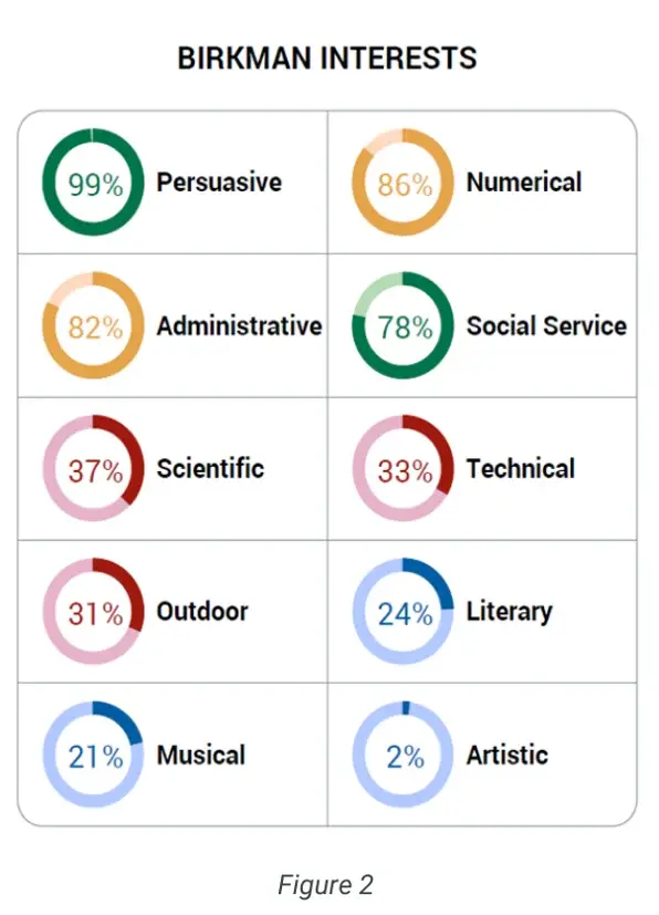 Finally, reveal insights into an individual's passions. These areas include Numerical, Persuasive, Administrative, Musical, Technical, and others. This helps us identify activities in which a candidate might thrive or when you should 'outsource' a task to someone else who is more passionate about that area, such as administrative tasks. Managers can then focus on new employees on activities where they have their greatest passions, which will give them the best chance for success. Note, Interests do not mean someone is bad or good at something. Interests are how much a person enjoys an activity.
