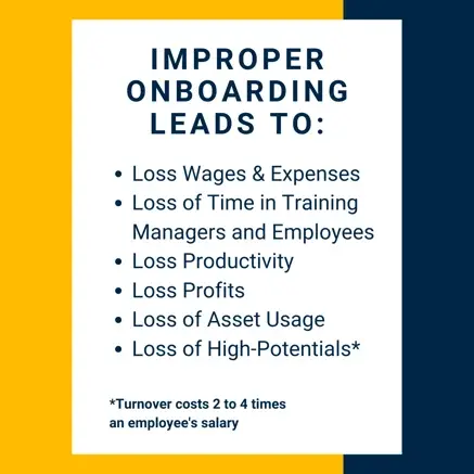 Turnover is costly. Many studies have shown that the cost of losing an employee within the first year is estimated to be two to four times their salary. Direct and indirect costs include lost wages, benefits, expenses, and assets of the employee who leaves, lost time the manager and team invested in training the employee, lost productivity of the whole team during the hiring and retraining of another employee, and this all negatively impacts profitability. In addition, your company's reputation can be directly tied to the success of a new employee acclimating quickly to their new role and into the company's culture.