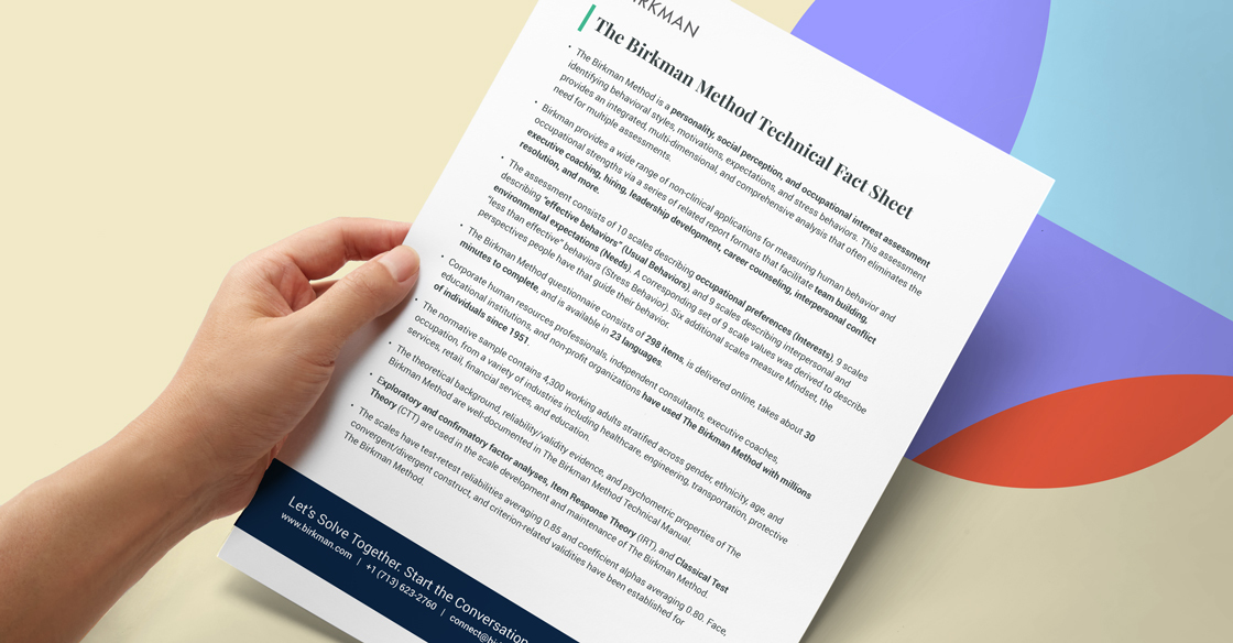 Our technical fact sheet includes information on the structure of the Birkman assessment, behavioral components covered, and data on reliability factors.
